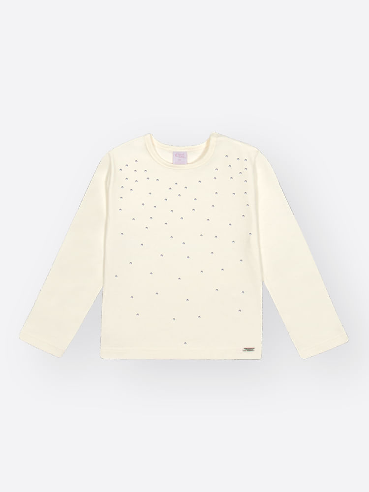Esta blusa é a base perfeita para looks cheios de conforto e brilho. Confeccionada em tecido cotton, a blusa é extremamente macia e leve, ideal para a pele sensível da criança, garantindo bem-estar em todas as brincadeiras e passeios. O design clássico e essencial é elevado por uma chuva de aplicações de Strass que se espalham pela peça, criando um efeito cintilante e delicado. Para maior facilidade ao vestir, a blusa conta com uma abertura no decote com botão de pressão, otimizando o tempo. É uma peça chave versátil, ideal para sobrepor coletes e jaquetas ou para ser a protagonista de um look casual chique, combinando facilmente com qualquer calça, short ou saia do guarda-roupa da sua menina.