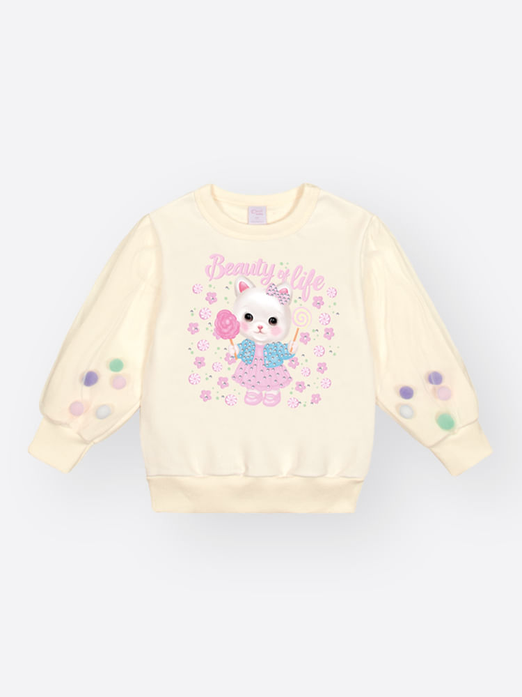 O blusão é a combinação perfeita de conforto aconchegante e estilo mágico. Confeccionado em Moletom Felpado, o corpo do blusão garante calor e maciez, ideal para os dias mais frios. O grande destaque lúdico são as Mangas em Tule sobrepostas, que trazem um visual etéreo e delicado. Dentro do tule, pompons soltos se movem, criando um efeito divertido e único. A estampa central é sublimada com personagens adoráveis (coelhinho ou gatinho), decorada com strass para um toque de brilho. Para facilitar a vestibilidade, possui abertura no decote com 2 botões de pressão. Punhos e barra são talhados para um ajuste confortável. É uma Edição Limitada, perfeita para criar looks encantadores em festas, passeios ou para adicionar um toque de fantasia ao dia a dia.