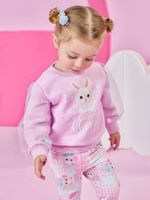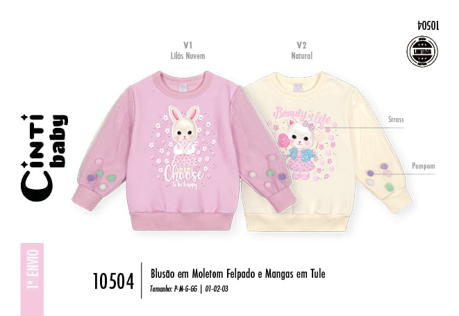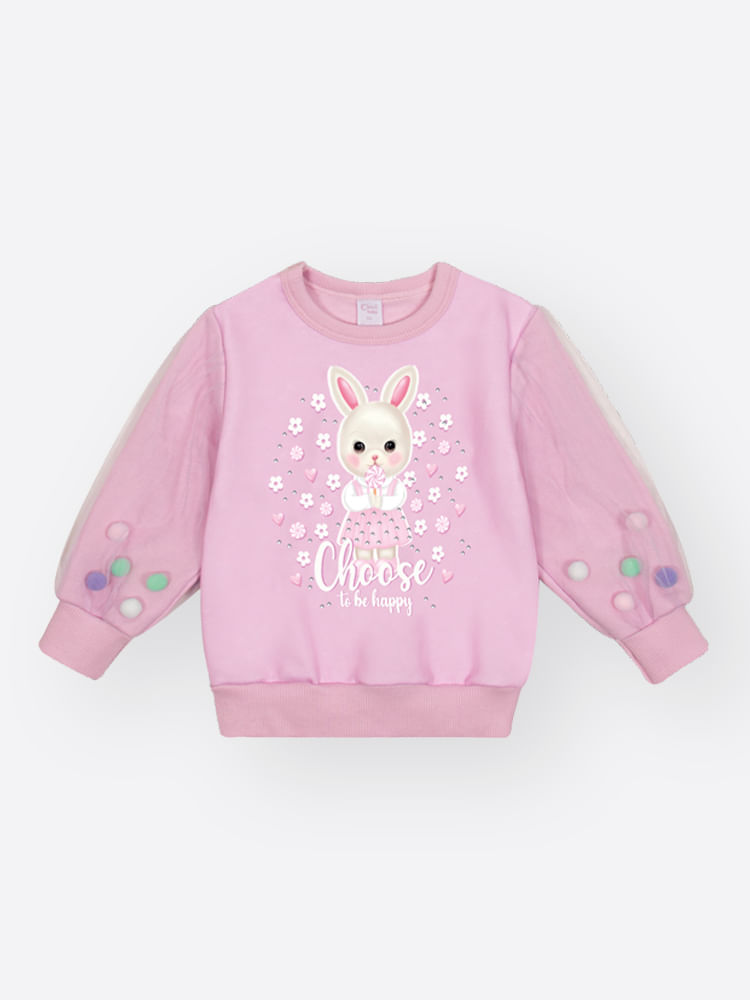 O blusão é a combinação perfeita de conforto aconchegante e estilo mágico. Confeccionado em Moletom Felpado, o corpo do blusão garante calor e maciez, ideal para os dias mais frios. O grande destaque lúdico são as Mangas em Tule sobrepostas, que trazem um visual etéreo e delicado. Dentro do tule, pompons soltos se movem, criando um efeito divertido e único. A estampa central é sublimada com personagens adoráveis (coelhinho ou gatinho), decorada com strass para um toque de brilho. Para facilitar a vestibilidade, possui abertura no decote com 2 botões de pressão. Punhos e barra são talhados para um ajuste confortável. É uma Edição Limitada, perfeita para criar looks encantadores em festas, passeios ou para adicionar um toque de fantasia ao dia a dia.