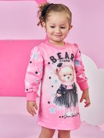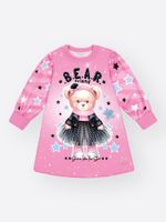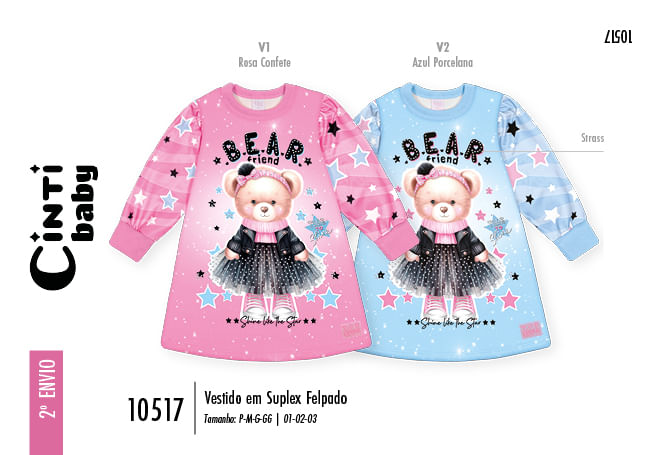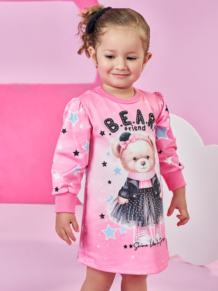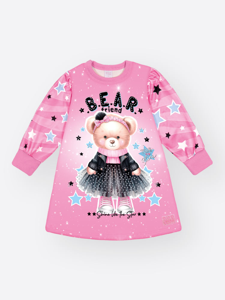 A estampa sublimada de fundo é coberta por um padrão de estrelas cadentes e a estampa central traz a frase ""B.E.A.R. friend"", destacando um ursinho fashion vestindo uma jaqueta e saia de tule. O toque de glamour fica por conta do strass, que ilumina a peça, e da etiqueta glitter na barra.