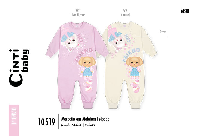 O Macacão Infantil em Moletom Felpado é a peça perfeita para garantir que seu bebê fique super aquecido e com um visual adorável. Confeccionado em Moletom Felpado, ele proporciona uma textura macia e aconchegante, ideal para os dias frios. Este macacão possui um design prático para o dia a dia e para a hora de vestir. Conta com abertura no decote com 2 botões de pressão e uma abertura inferior com botões de pressão para facilitar a troca de fraldas. Os punhos e as barras são talhados, garantindo um ajuste confortável. A estampa sublimada central traz a mensagem ""Hey Friend"" e apresenta adoráveis personagens, como um cachorrinho de lacinho e um coelhinho, com detalhes em strass que adicionam um brilho sutil e fofo. Este macacão é ideal para manter o bebê confortável, quentinho e cheio de estilo.