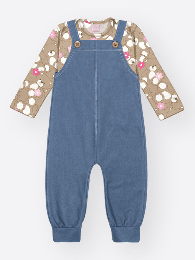 Jardineira em Molecotton Denim: A peça principal é feita em Molecotton Denim, que proporciona o visual do jeans com o conforto e a elasticidade do moletom. O modelo é prático e possui alças ajustáveis e abertura com botão de pressão na cintura. O charme fica por conta dos botões em formato de urso.