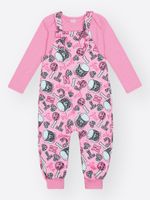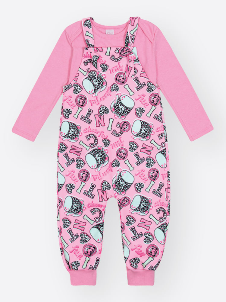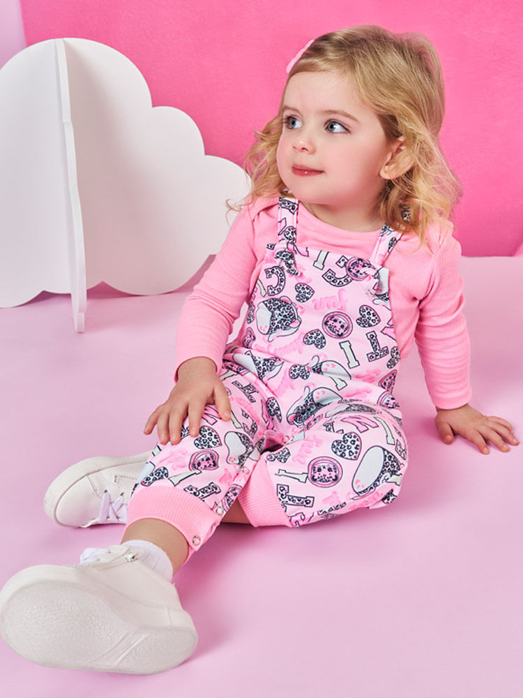 A estampa sublimada na jardineira é alegre e lúdica, com um padrão divertido de bombons e pirulitos, adicionando um toque açucarado e colorido ao look. O fechamento é feito por botões de pressão prateados.