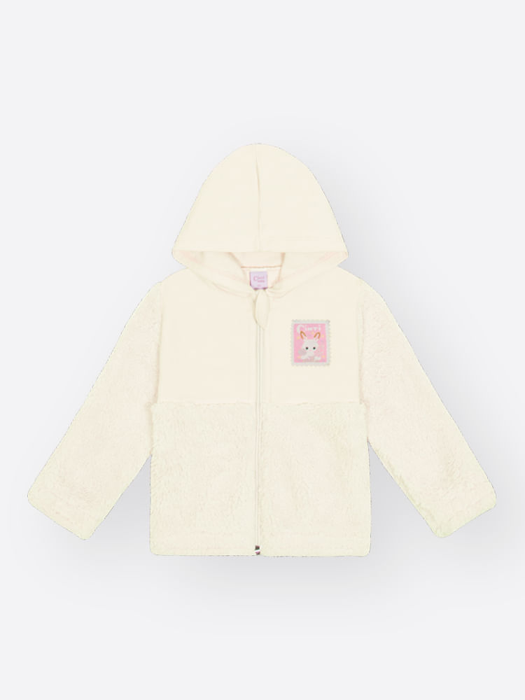 Jaqueta com Capuz: Confeccionada em Moletom Felpado com mangas, e com recorte e mangas em Pelo Carneiro, ela proporciona um toque extremamente macio e aconchegante. Possui zíper com proteção e um ajuste confortável na barra e punhos com elástico rebatido. A jaqueta é finalizada com uma charmosa etiqueta coelho bordada no peito.