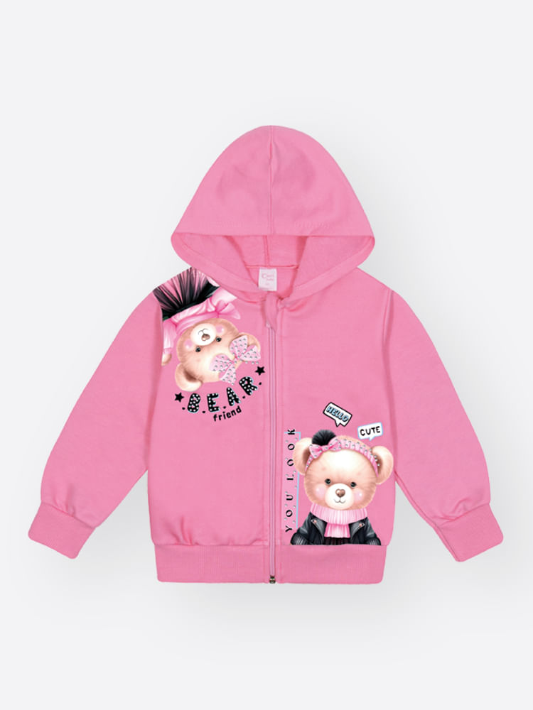 A estampa sublimada na jaqueta traz a mensagem "B.E.A.R. friend" e apresenta dois ursinhos fashion com roupas estilosas. O detalhe de brilho é garantido pelo strass, que ilumina a peça.