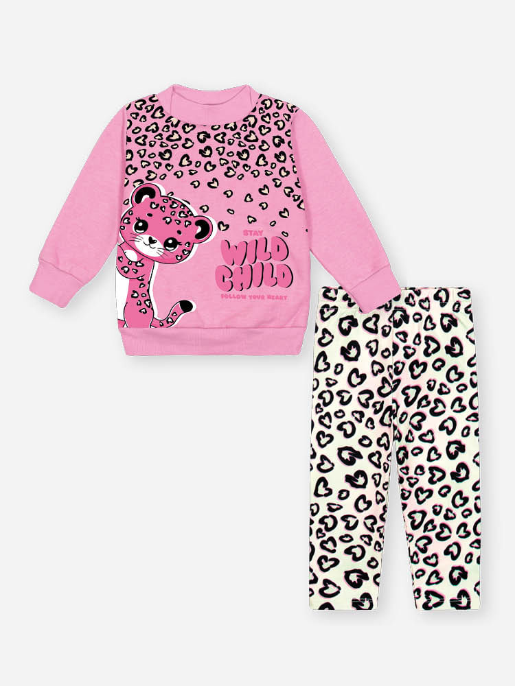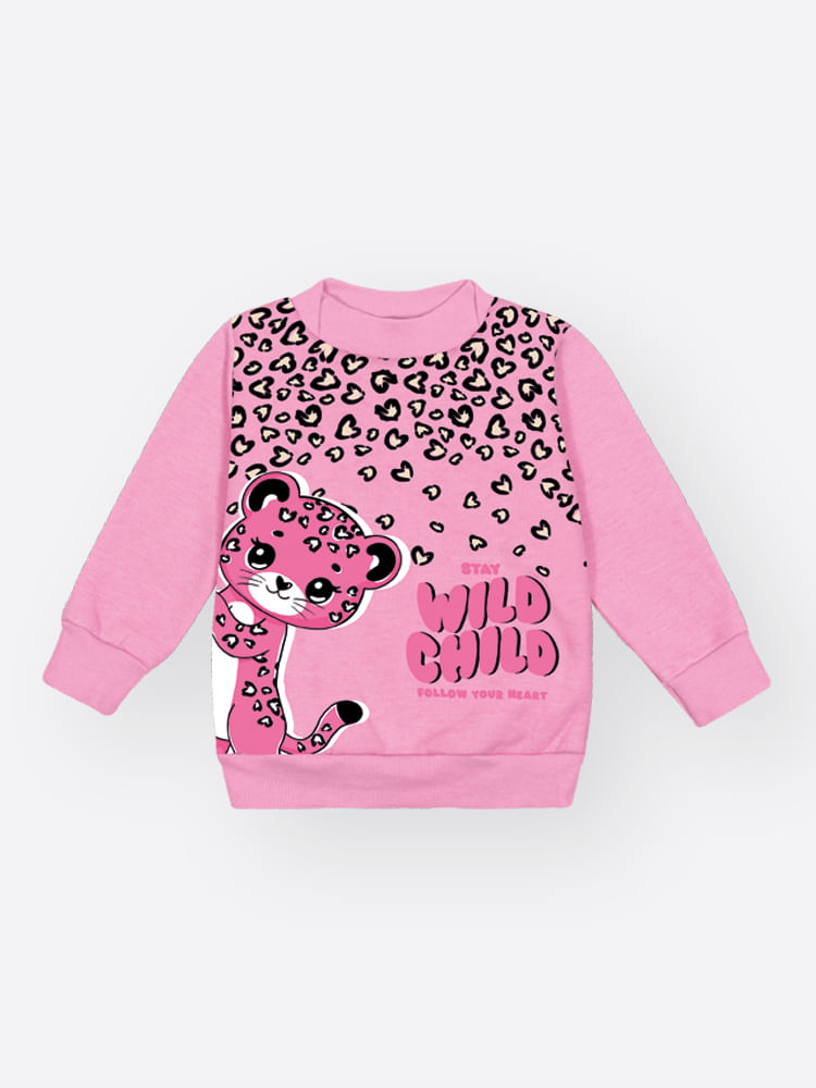 A estampa central traz uma oncinha rosa super fofa com a escrita ""WILD CHILD"", e é realçada por uma estampa puff que cria um efeito 3D.