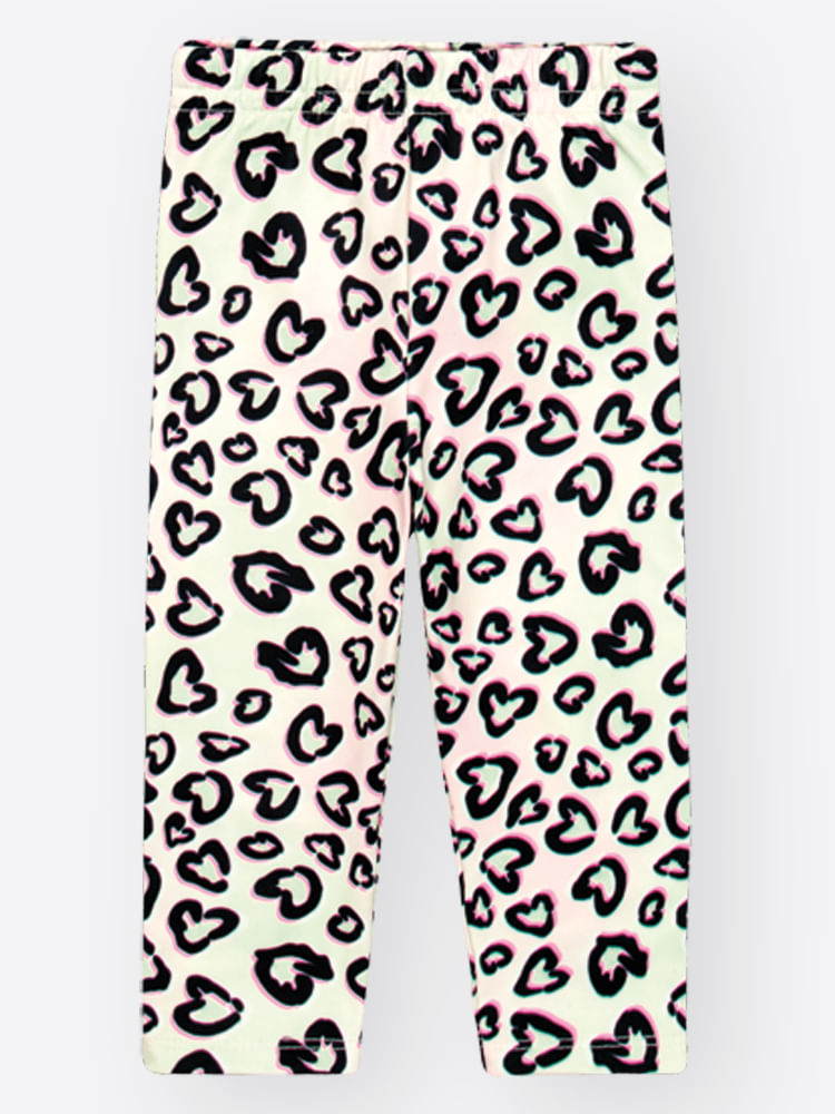 A calça conta com sublimação rolo em toda a peça, com uma padronagem divertida de corações e manchas de oncinha em tons de rosa.