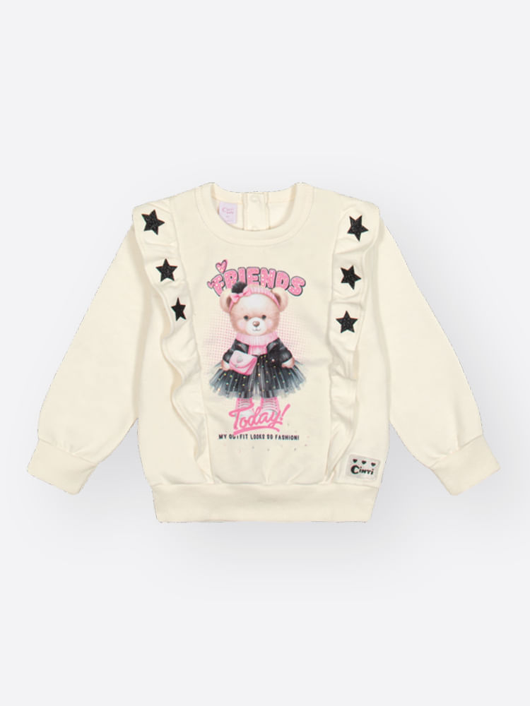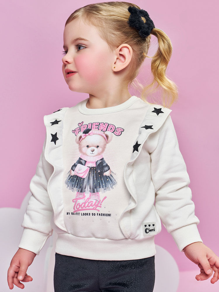 A estampa sublimada com aplique termocolante central apresenta uma ursinha vestida de rocker em uma saia de tule com a escrita ""BEST FRIENDS"", e é realçada por apliques termocolantes de estrelas e detalhes em strass. A peça é finalizada com uma etiqueta glitter preta na barra.