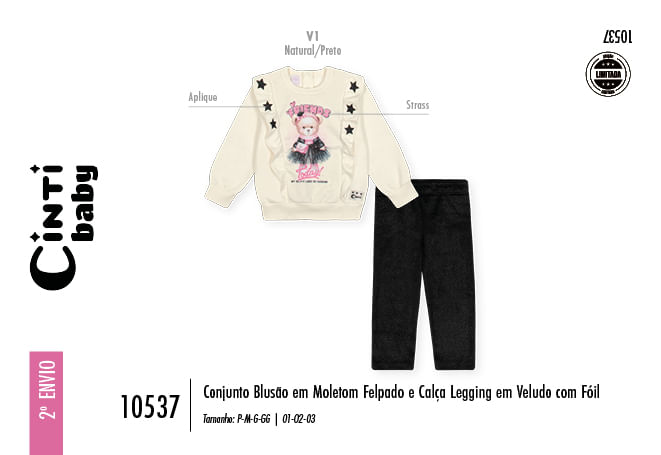 "O Conjunto Blusão e Calça Legging é perfeito para as pequenas que amam looks cheios de atitude e conforto. Este conjunto combina a maciez do moletom com o charme brilhante do veludo, ideal para os dias frios.