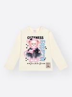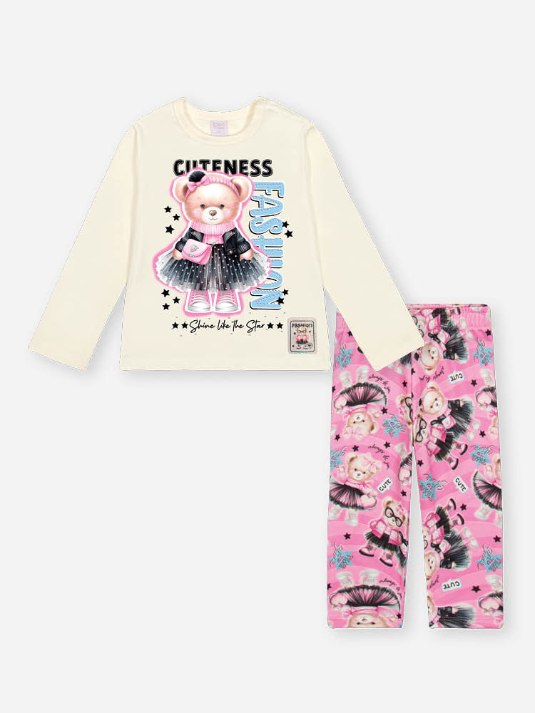 A estampa sublimada central é moderna e traz uma ursinha vestida em estilo fashion com a escrita ""CUTENESS FASHION"", e é realçada por detalhes em strass, que adicionam um brilho delicado. A peça é finalizada com uma etiqueta holográfica urso na barra.