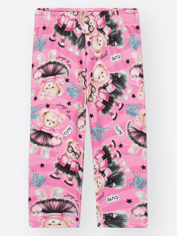 A legging conta com sublimação rolo em toda a peça, com uma padronagem divertida de ursinhos, guarda-chuvas e estrelas em um fundo rosa vibrante.