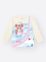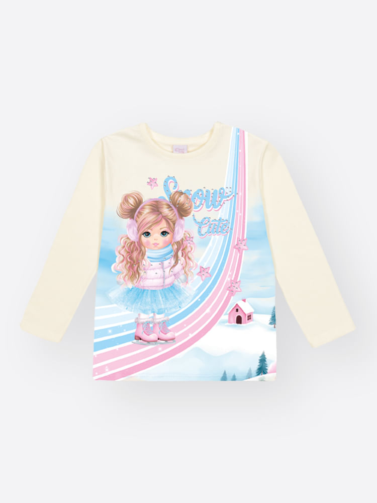 A estampa sublimada central apresenta uma princesa no gelo com a escrita ""Snow Cute"". A peça é adornada com strass e um aplique na saia em Tule Fóil/corte a fio, adicionando textura e brilho tridimensional.