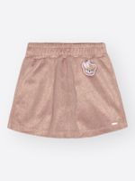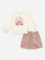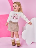 Shorts-Saia: A parte inferior é um charmoso shorts saia confeccionado em Veludo com Fóil, que proporciona textura e um brilho delicado em tons de bege. O cós é colocado com elástico e possui um puxador decorativo.