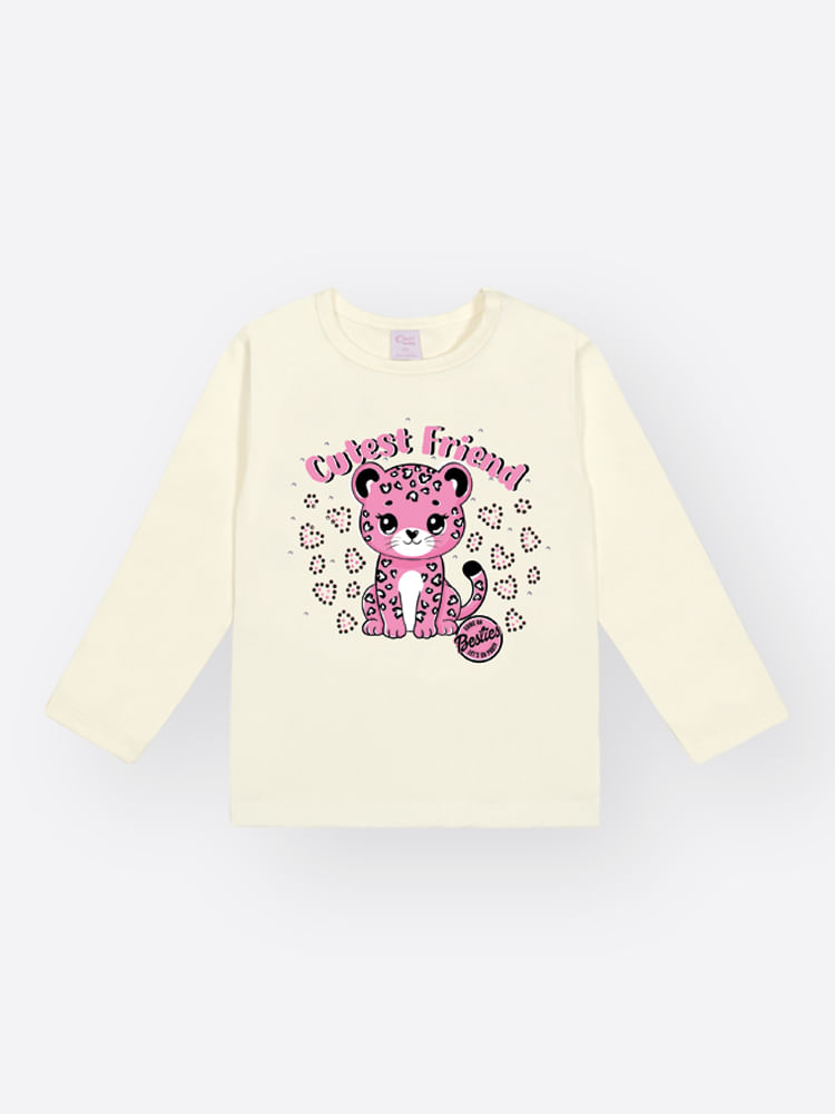 A estampa central (em estampa quadro) traz uma oncinha rosa super fofa com a escrita ""CUTEST FRIEND"", e é realçada por detalhes em strass, adicionando um brilho delicado.