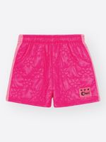 Shorts: A parte inferior é um shorts moderno, com a frente em Matelassê Floral e a parte de trás em Suplex. Possui cós com elástico rebatido e bolso falso. O shorts se destaca pela sua textura floral em alto relevo e pelo acabamento com uma etiqueta emborrachada glitter preta.