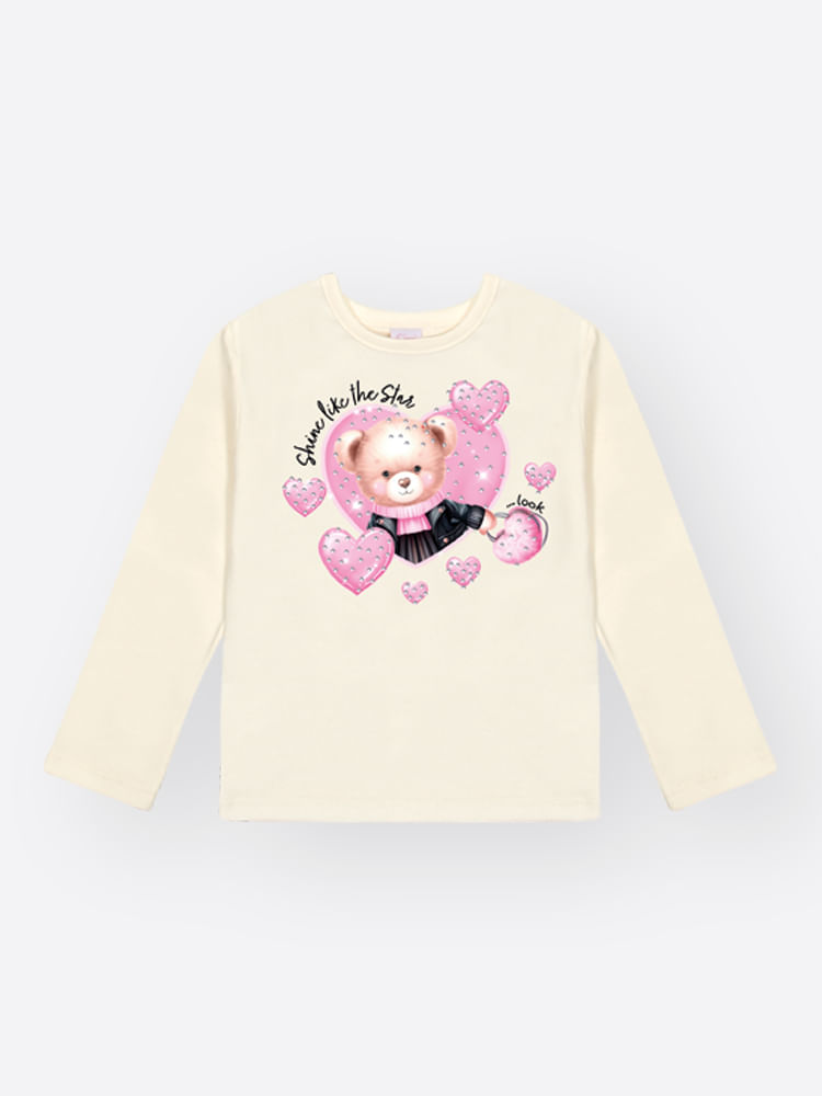 A estampa sublimada central apresenta uma ursinha em estilo rocker com óculos de sol e a escrita ""Shine Like the Stars"", transmitindo atitude e fofura. O detalhe de brilho é garantido pelo strass.