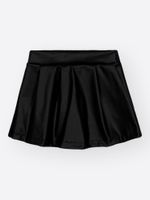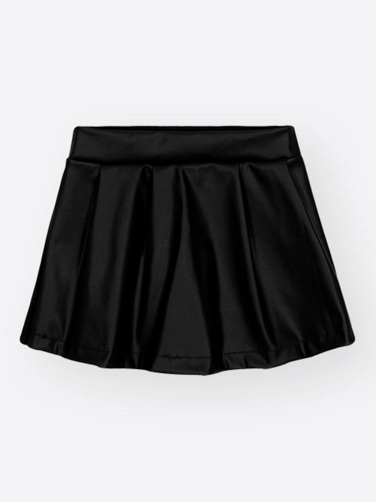 Short-Saia: A parte inferior é um charmoso short-saia preto confeccionado em P.U (Poliuretano), que imita couro, adicionando um toque de textura e modernidade.