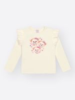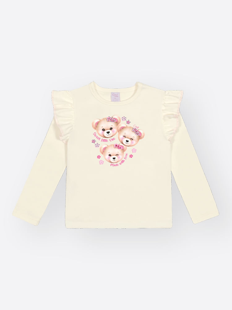 A estampa sublimada central apresenta três ursinhas fofas com laços de flores, e é realçada por detalhes em strass, que adicionam um brilho delicado. Para facilitar ao vestir, possui abertura com botão de pressão no decote.