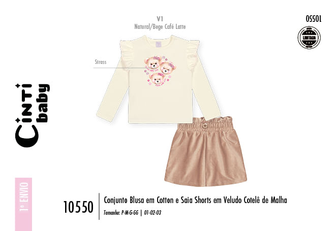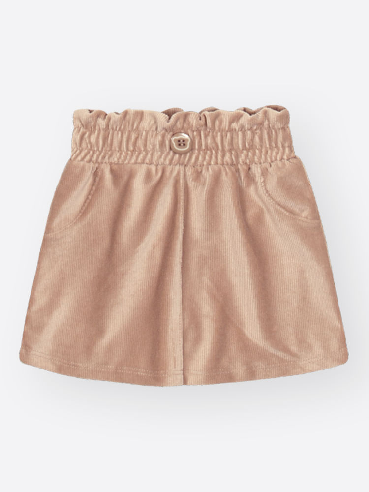 Saia Shorts: A parte inferior é uma saia shorts charmosa e confortável, feita em Veludo Cotelê de Malha em tom de Bege Café Latte, proporcionando uma textura aconchegante. A saia possui um cós colocado clochard com elástico, que cria um efeito franzido e estiloso.