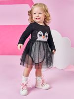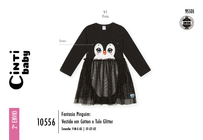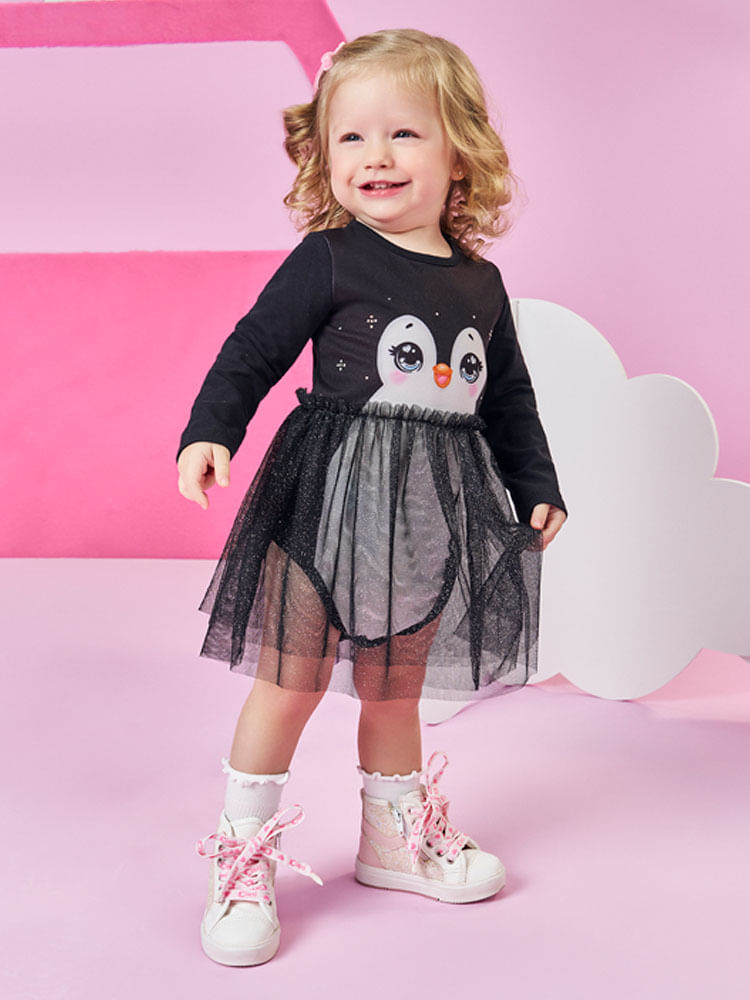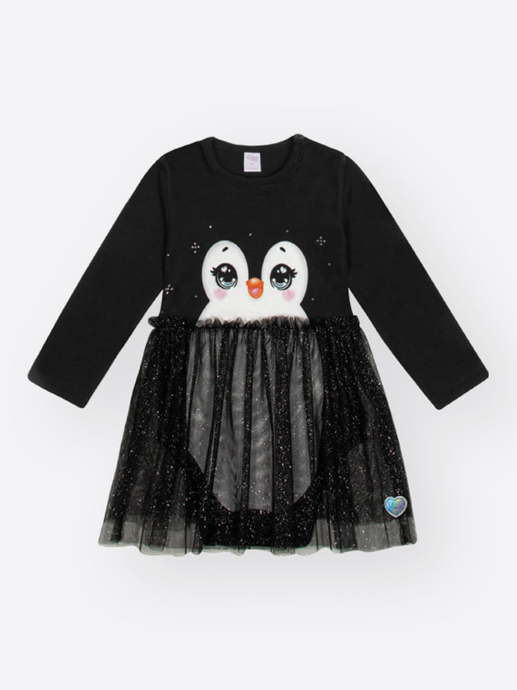 Confeccionado em Cotton, o vestido de mangas longas oferece um toque suave e confortável. Possui abertura no ombro com 2 botões de pressão, facilitando ao vestir. A parte superior em Cotton (Preto ou Natural) apresenta a estampa sublimada do rosto de um pinguim fofo, realçada por detalhes em strass, que adicionam um brilho delicado.