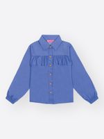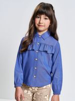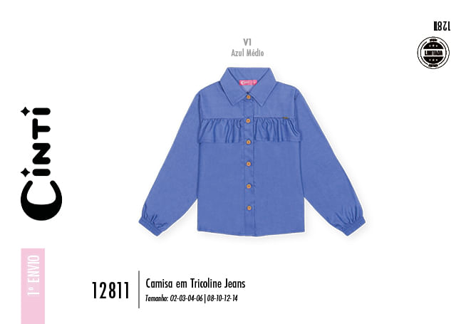 "A Camisa em Tricoline Jeans da Cinti é a união perfeita entre o visual rústico do jeans e a leveza da tricoline, resultando em uma peça cheia de estilo para as pequenas. Com uma lavagem em tom azul médio, esta camisa de manga longa destaca-se pelo charmoso recorte frontal com babado franzido, que atravessa o peito e confere um ar romântico e moderno à peça.