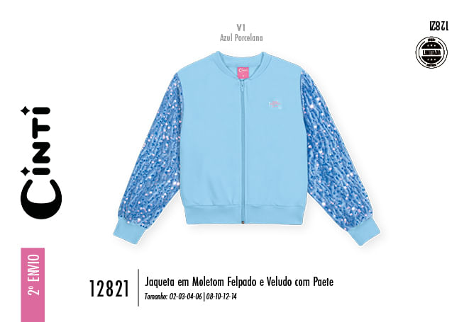 "Esta jaqueta da Cinti é a combinação perfeita entre o conforto do moletom felpado e o brilho glamoroso do paetê, transformando qualquer look básico em uma produção cheia de estilo. O corpo em moletom garante um toque macio e aquecido, enquanto as mangas em veludo splendor com aplicação de paetês e forro em meia malha oferecem um visual moderno e sofisticado sem abrir mão do bem-estar. Com modelagem boxy, a peça conta com gola talhada e fechamento frontal por zíper de nylon na cor da peça, além de punhos e barra talhados que proporcionam um ajuste confortável e estruturado ao corpo. O detalhe especial fica por conta da delicada etiqueta aplicada no peito, que reforça o charme exclusivo da marca.