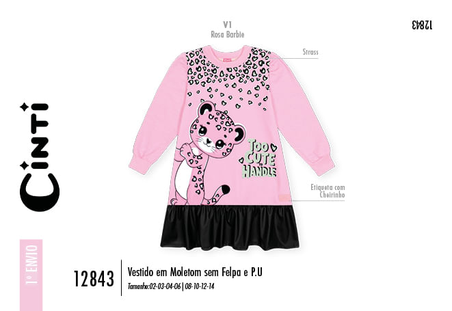 "Este vestido da Cinti é a definição de modernidade e estilo para as pequenas fashionistas, combinando a leveza do moletom sem felpa com a atitude urbana do P.U (poliuretano). A parte superior conta com mangas longas e uma modelagem confortável, enquanto a saia em material sintético traz um brilho sofisticado que eleva o visual para qualquer ocasião especial. O grande diferencial desta peça é a experiência sensorial: ela possui uma etiqueta exclusiva com cheirinho adocicado, que torna o momento de vestir ainda mais lúdico e memorável, reforçando o cuidado e o carinho em cada detalhe da marca.