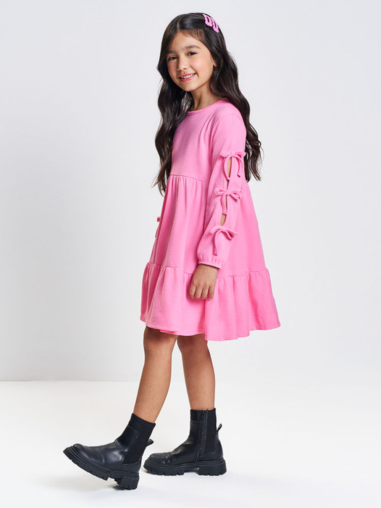 Este vestido é extremamente versátil e transita facilmente entre o estilo casual e o mais arrumado. Para os dias mais frescos de outono e inverno, combine-o com uma meia-calça grossa e botinhas de cano curto ou coturnos, criando um look fashionista e quentinho. Se a ideia for um passeio no shopping ou uma festa de aniversário, um sapatinho tipo boneca e uma tiara delicada completam o visual com doçura. Por ser uma peça lisa em tecido encorpado, ele dispensa o uso de muitos acessórios, deixando o destaque para os detalhes de laços nas mangas."
