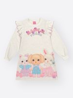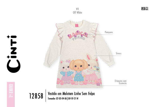"Este encantador vestido infantil em moletom linho sem felpa da marca Cinti é a tradução de delicadeza e conforto para o dia a dia das pequenas. Com uma modelagem reta e moderna, a peça se destaca pelos charmosos babados frufru contrastantes nos ombros, que conferem um toque romântico e diferenciado ao visual. A estampa lúdica Magical Friend traz personagens fofos em uma composição rica em detalhes, finalizada com o brilho suave de strass aplicados e pompons coloridos que dão um relevo divertido e interativo à peça. Para completar a experiência sensorial, o vestido possui uma etiqueta especial com essência, unindo estilo e um cheirinho delicioso que encanta crianças e adultos.
