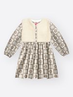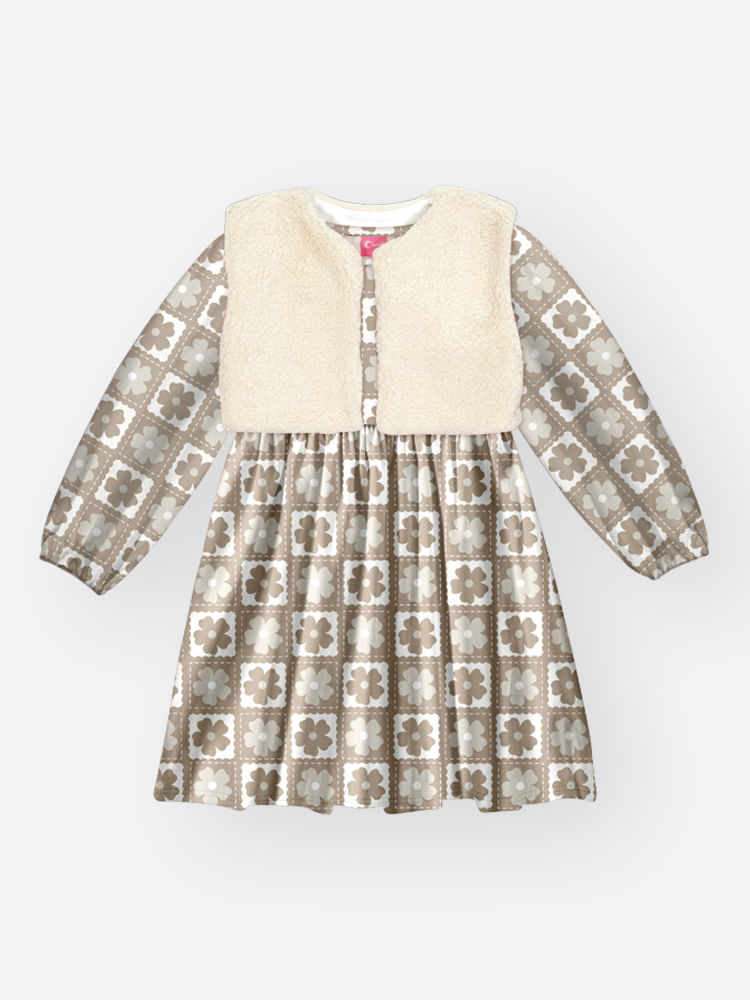 "Este sofisticado conjunto infantil da marca Cinti é a escolha ideal para compor um visual elegante e quentinho na coleção de Inverno 2026. O conjunto é composto por um vestido em cotton linho, que apresenta uma estampa sublimada delicada por toda a peça, trazendo um ar clássico e atemporal. O vestido possui mangas longas com charmosos franzidos nos ombros e punhos com elástico, garantindo conforto e um ajuste perfeito ao corpo. Para elevar a produção, o colete em pelo carneirinho sobreposto adiciona uma textura macia e luxuosa, além de contar com forro em meia malha para maior suavidade no contato com a pele. O toque final de sofisticação fica por conta da plaquinha de metal prata, reforçando a qualidade e o cuidado nos detalhes característicos da marca.