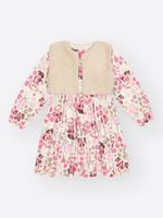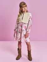 "Este sofisticado conjunto infantil da marca Cinti é a escolha ideal para compor um visual elegante e quentinho na coleção de Inverno 2026. O conjunto é composto por um vestido em cotton linho, que apresenta uma estampa sublimada delicada por toda a peça, trazendo um ar clássico e atemporal. O vestido possui mangas longas com charmosos franzidos nos ombros e punhos com elástico, garantindo conforto e um ajuste perfeito ao corpo. Para elevar a produção, o colete em pelo carneirinho sobreposto adiciona uma textura macia e luxuosa, além de contar com forro em meia malha para maior suavidade no contato com a pele. O toque final de sofisticação fica por conta da plaquinha de metal prata, reforçando a qualidade e o cuidado nos detalhes característicos da marca.