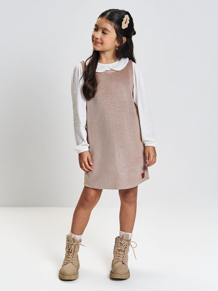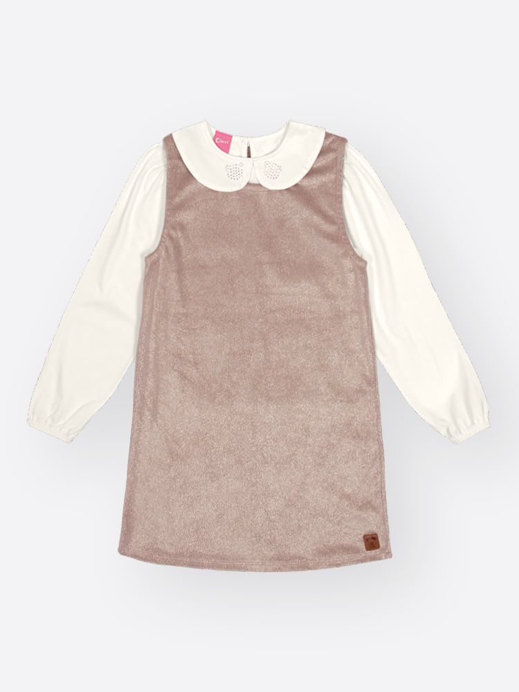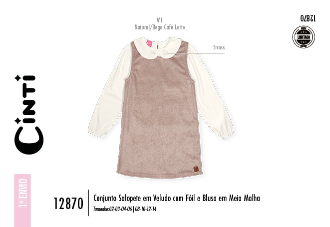 "Prepare o guarda-roupa para os momentos mais especiais com o conjunto infantil feminino da Cinti, uma peça que exala sofisticação e brilho suave para o inverno 2026. Este duo encantador é composto por uma salopete em veludo com acabamento em foil, que confere um efeito glow luminoso e toque extremamente macio, ideal para destacar a produção com elegância. O design estruturado da salopete é finalizado com uma charmosa etiqueta decorativa de ursinho em P.U. na barra, trazendo um detalhe lúdico e exclusivo à peça.