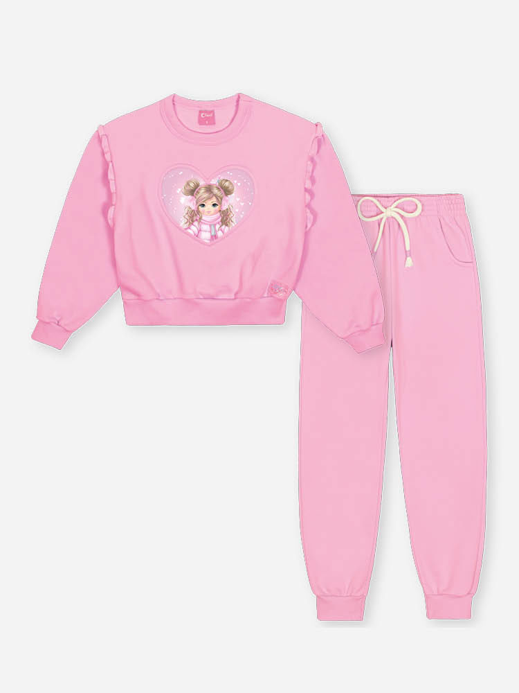 "O conjunto infantil feminino da Cinti é a união perfeita entre o aconchego necessário para o inverno e a delicadeza que encanta as meninas. Confeccionado em moletom felpado de alta qualidade, este conjunto garante um toque peluciado interno que mantém o calor corporal, sendo extremamente macio e confortável para o uso prolongado. O blusão possui modelagem moderna com cavas levemente deslocadas e um charmoso detalhe de franzido frufru nos ombros, que confere um ar romântico e diferenciado à peça. A calça no estilo jogger completa o look com praticidade, apresentando cós elástico rebatido para um ajuste seguro, cadarço decorativo e bolsos arredondados funcionais que trazem um toque esportivo e casual.