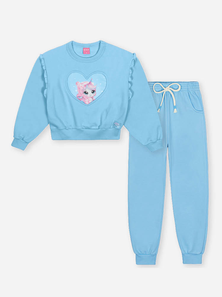 O destaque visual fica por conta do aplique frontal delicado, que utiliza sublimação em folha para criar uma estampa lúdica e moderna com a temática Snow. Os punhos e barras em ribana talhada garantem que o calor não escape, proporcionando um caimento perfeito que acompanha todos os movimentos da criança. É o conjunto ideal para mães que buscam uma roupa de frio infantil que seja fácil de lavar, durável e que deixe a pequena pronta para qualquer aventura com muito estilo e doçura.