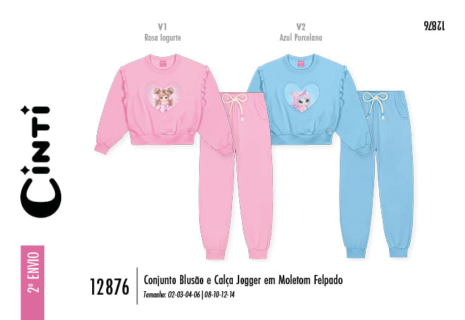 "O conjunto infantil feminino da Cinti é a união perfeita entre o aconchego necessário para o inverno e a delicadeza que encanta as meninas. Confeccionado em moletom felpado de alta qualidade, este conjunto garante um toque peluciado interno que mantém o calor corporal, sendo extremamente macio e confortável para o uso prolongado. O blusão possui modelagem moderna com cavas levemente deslocadas e um charmoso detalhe de franzido frufru nos ombros, que confere um ar romântico e diferenciado à peça. A calça no estilo jogger completa o look com praticidade, apresentando cós elástico rebatido para um ajuste seguro, cadarço decorativo e bolsos arredondados funcionais que trazem um toque esportivo e casual.
