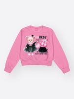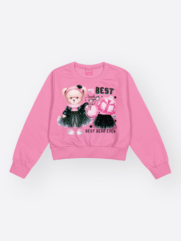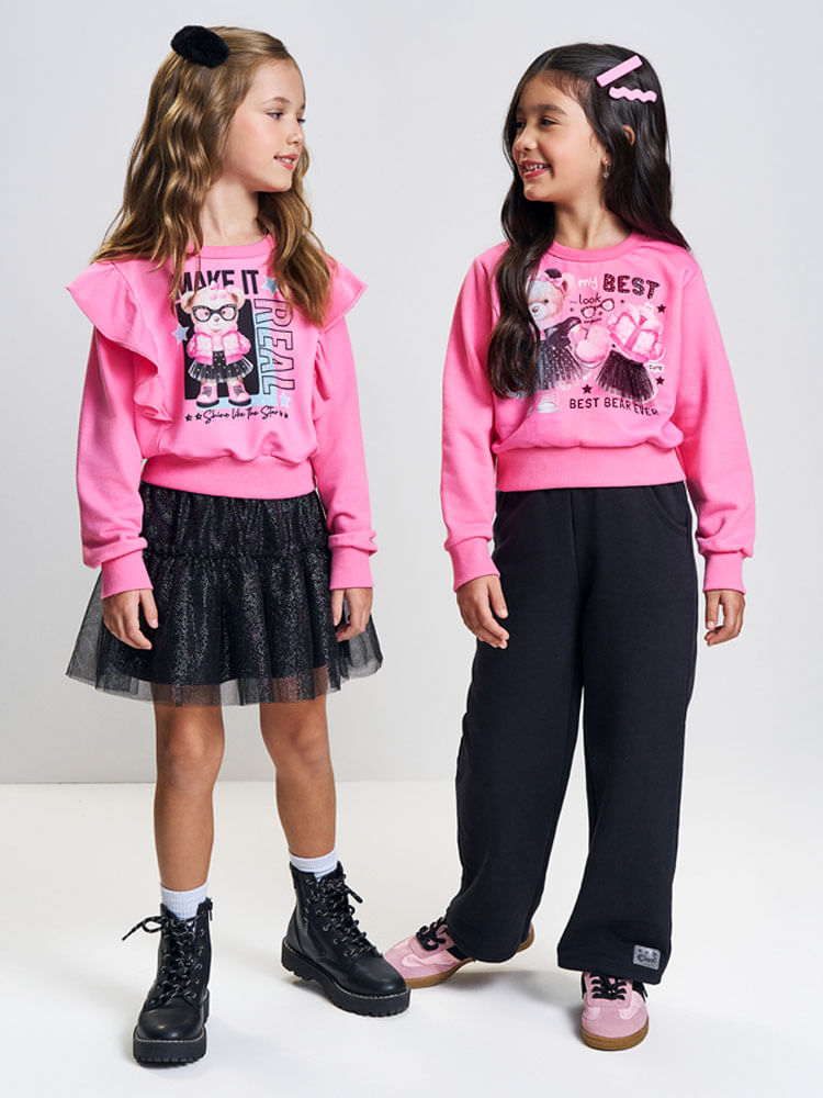 O grande diferencial lúdico desta peça está na estampa frontal, que traz a frase Best em um design moderno acompanhada de uma saia em tule aplicada diretamente na costura do blusão, criando um efeito 3D divertido e delicado. Para dar aquele brilho que as meninas amam, a estampa é enriquecida com detalhes em strass, que adicionam um ponto de luz sofisticado à produção. Finalizado com punhos e barras em ribana e uma estilosa etiqueta de glitter, este conjunto é a definição de uma moda infantil que equilibra perfeitamente a diversão com a qualidade premium.