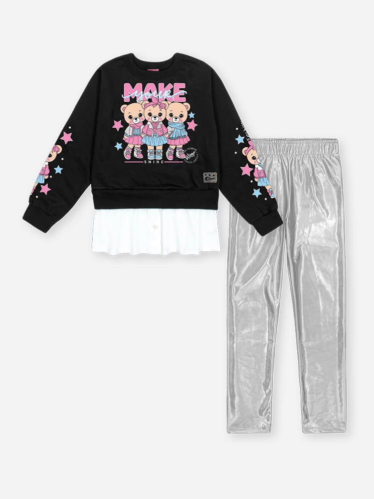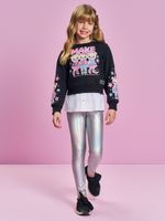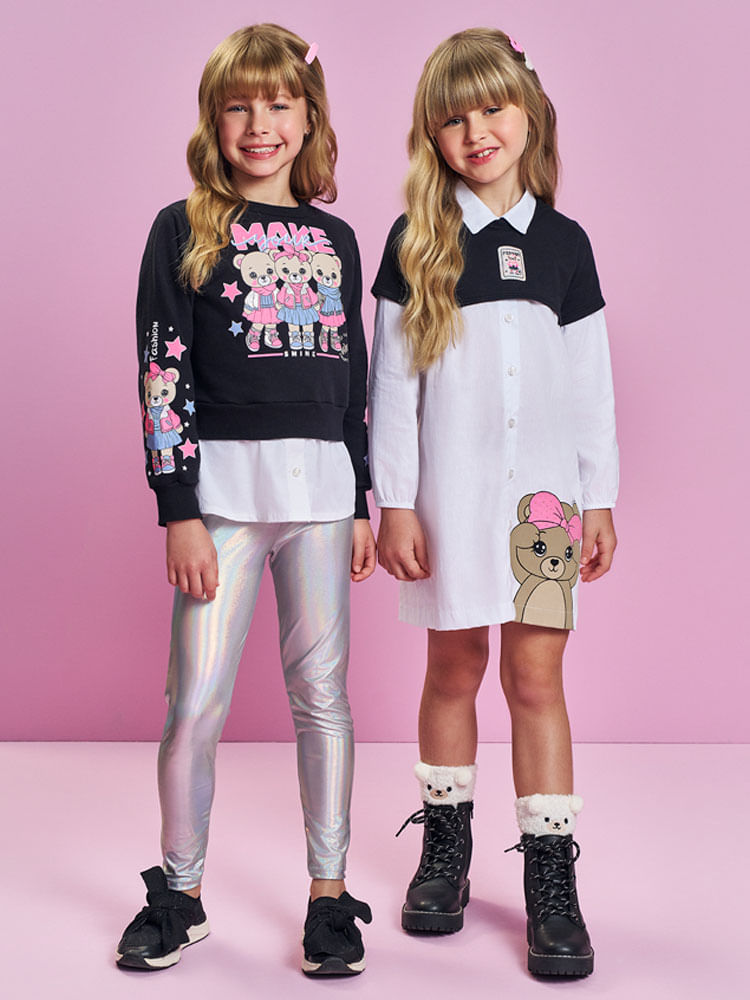 Este conjunto é a aposta certa para festinhas de aniversário, idas ao cinema ou passeios no shopping onde a criança quer um visual de blogueirinha. Devido ao brilho da legging, ele combina maravilhosamente bem com um tênis casual de sola alta ou uma bota estilo coturno. Como o blusão possui detalhes em tricoline, a produção já nasce completa e sofisticada. Nos dias de frio mais intenso, combine com um colete de pelos ou uma jaqueta jeans para criar um look em camadas super moderno e quentinho."