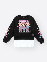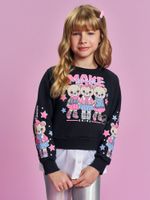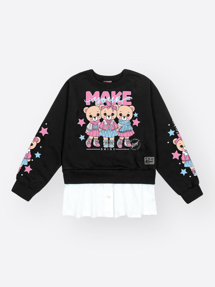 O charme lúdico e antenado deste conjunto é evidenciado pelas estampas frontais e nas mangas com a temática Make, ideais para as meninas que adoram o universo da beleza e da moda. Para adicionar um toque extra de brilho, a peça conta com uma etiqueta em glitter e um detalhe de vista fake com botão personalizado, reforçando o cuidado e a exclusividade de cada detalhe. É a escolha ideal para mães que buscam uma roupa de inverno infantil que seja prática, durável e cheia de personalidade.