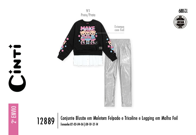 "Destaque o visual da sua pequena com este conjunto infantil feminino da Cinti, uma composição que une perfeitamente o conforto do estilo comfy com o brilho da moda glam para o inverno 2026. O blusão em moletom felpado garante um toque interno peluciado e aconchegante, apresentando um design rico em texturas com detalhes em tricoline que conferem um acabamento refinado à peça. A calça legging em malha foil é o grande diferencial do look, oferecendo um brilho metalizado moderno e sofisticado, com cós elástico rebatido que garante um ajuste perfeito e total liberdade de movimentos.