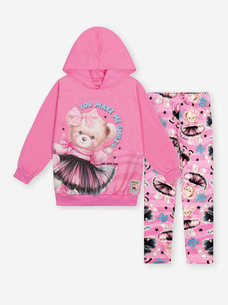 "Prepare-se para deixar os dias de frio muito mais alegres com este Conjunto Infantil Feminino de Inverno, uma peça essencial que combina o toque lúdico da marca Cinti com o máximo conforto. O conjunto é composto por um blusão alongado com capuz e uma calça legging, ambos confeccionados em suplex felpado, garantindo um toque macio e excelente proteção térmica para as crianças. O blusão destaca-se pela estampa encantadora de uma ursinha bailarina, finalizada com detalhes em strass que trazem um brilho delicado e especial à peça.