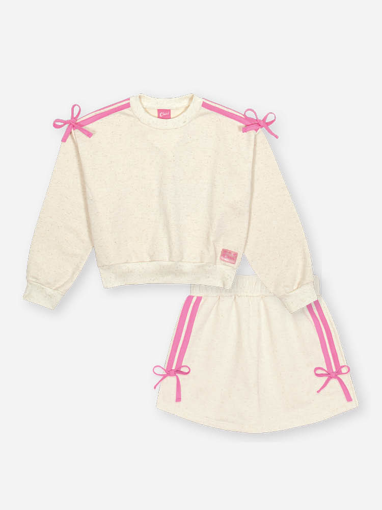 "O Conjunto Infantil Feminino de Meia Estação da Cinti é a escolha perfeita para quem busca um visual moderno, unindo o conforto do estilo esportivo com a delicadeza dos detalhes românticos. Confeccionado em moletom linho sem felpa, este conjunto oferece uma textura leve e sofisticada, ideal para climas amenos onde o bem-estar é prioridade. O blusão possui modelagem boxy com cavas deslocadas, garantindo um caimento atual e despojado, enquanto o short-saia proporciona total liberdade de movimento para as brincadeiras do dia a dia.