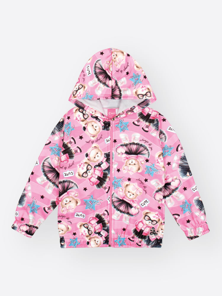 O grande diferencial deste agasalho é a sua estampa rotativa lúdica, que preenche todo o conjunto com ilustrações encantadoras de ursinhas bailarinas e estrelas, criando um visual coordenado e cheio de personalidade. Para um toque extra de brilho, a peça conta com uma etiqueta decorativa em glitter, reforçando o cuidado com os detalhes que é marca registrada da coleção.