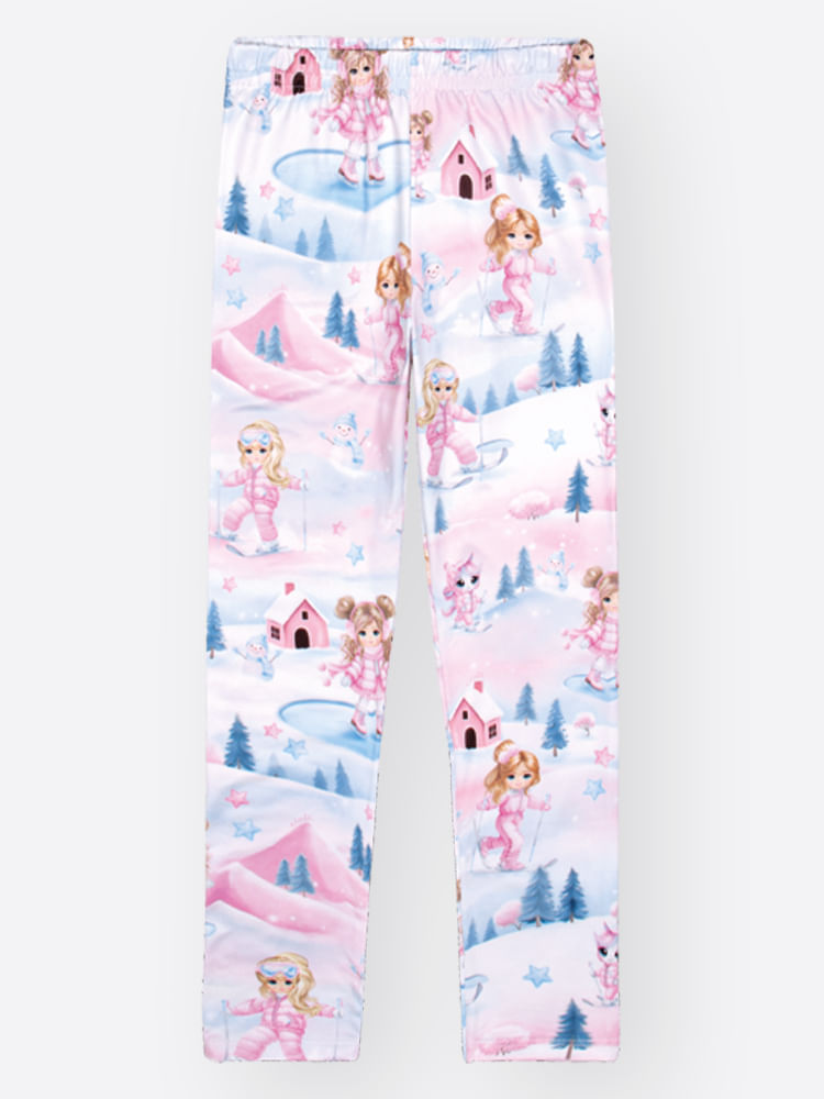 A calça legging complementa o visual com praticidade, apresentando uma estampa corrida (sublimação de rolo) que coordena harmoniosamente com o tema da blusa. O cós com elástico rebatido oferece um ajuste seguro, permitindo que a criança brinque e se movimente com total liberdade.