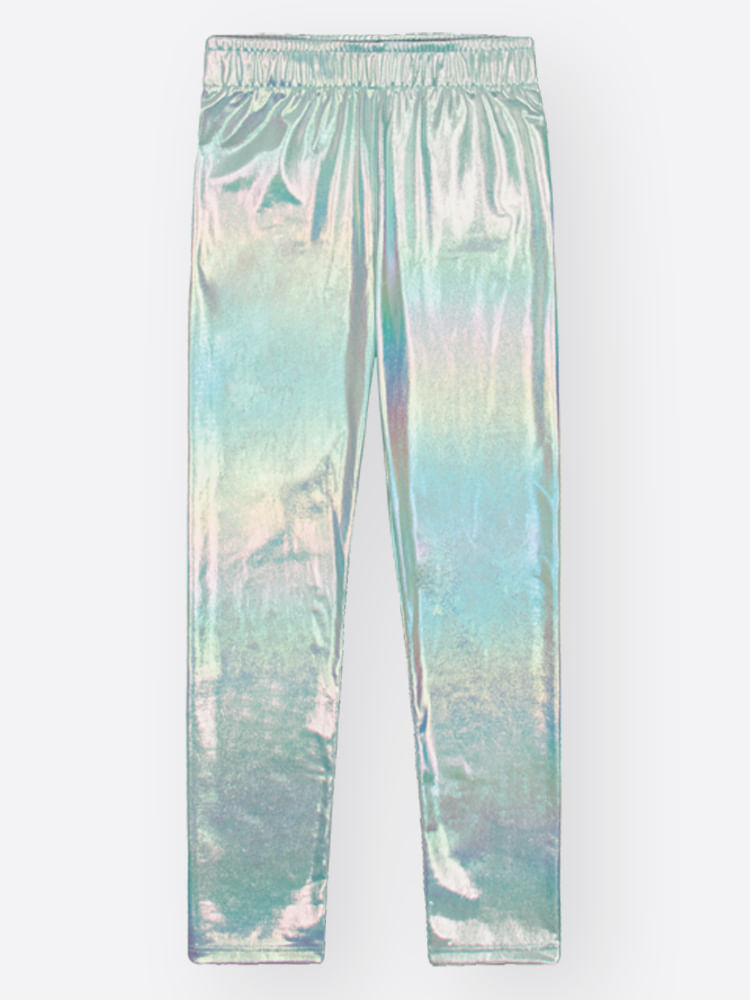 A calça legging em malha foil complementa o conjunto com muito estilo, apresentando um brilho sutil que é tendência na moda infantil. O cós com elástico rebatido garante um ajuste seguro e flexível, permitindo que a criança se movimente com total liberdade e conforto durante todo o dia.