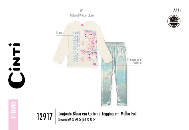 "Este encantador conjunto infantil feminino da marca Cinti, integrante da Coleção Inverno 2026, é a escolha ideal para quem busca um visual glam e confortável para as meninas. O look é composto por uma blusa em cotton de toque macio e uma calça legging em malha foil, que se destaca pelo seu brilho metalizado moderno e sofisticado. A blusa possui uma modelagem confortável com comprimento ideal para acompanhar a legging e encanta com uma estampa frontal lúdica de ursinha, que ganha vida através da técnica de sublimação e o brilho delicado de detalhes em strass. Um detalhe especial é a etiqueta decorativa com essência, que traz um toque sensorial único à peça.