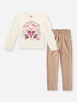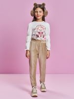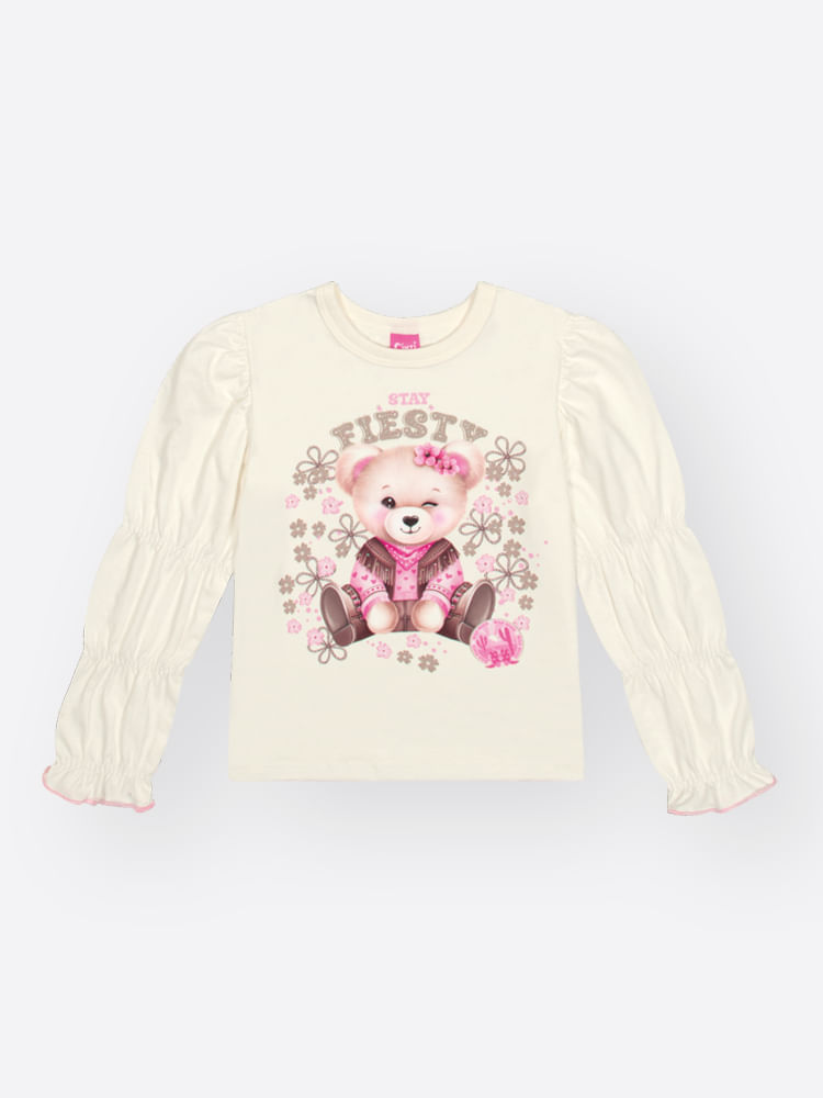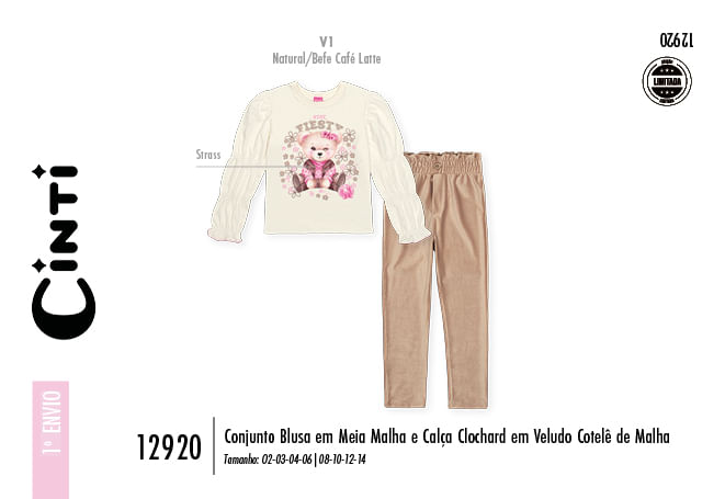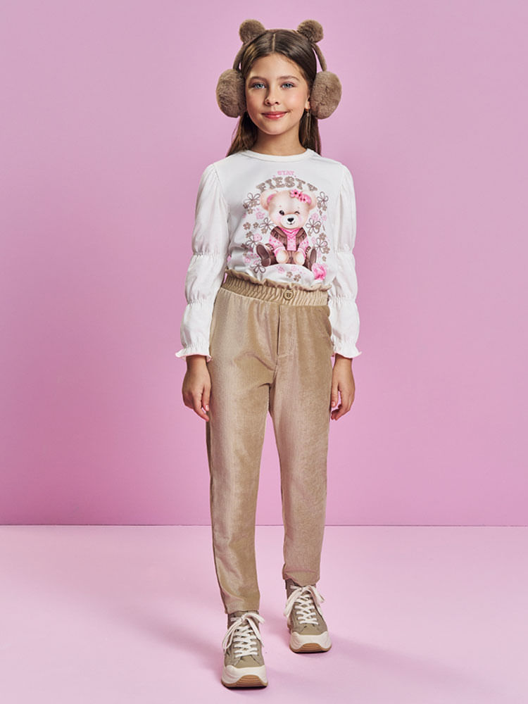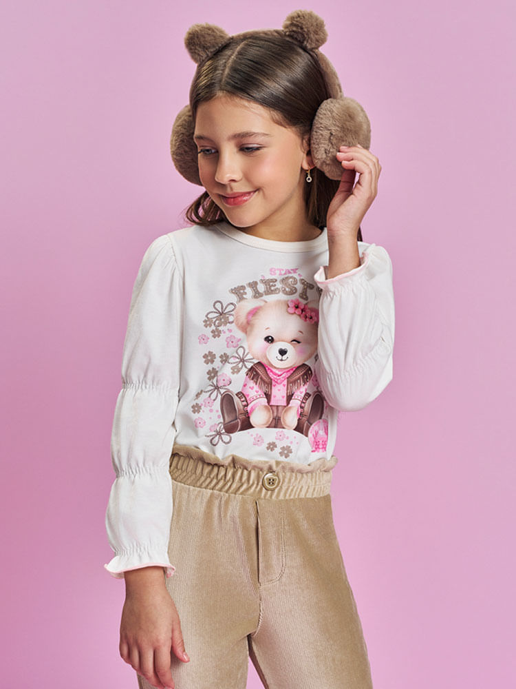 "Este sofisticado conjunto infantil feminino da coleção Inverno 2026 é a escolha ideal para quem busca um visual que une elegância clássica e conforto moderno. A blusa, confeccionada em meia malha leve e macia, destaca-se pelas mangas longas com delicado franzido nos ombros e acabamento em lastex nos punhos com efeito frufru, conferindo um toque romântico e lúdico à peça. A estampa central de uma dócil ursinha é realçada pelo brilho sutil do strass, elevando o charme da composição.