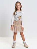 Pensado para oferecer total liberdade de movimentos, o conjunto apresenta acabamentos premium, como o cós elástico que une a meia malha e o tule, garantindo um ajuste seguro e confortável para todas as brincadeiras. Detalhes como o recorte franzido com acabamento a fio e a exclusiva etiqueta emborrachada dourada reforçam o cuidado e a sofisticação da marca. Este lookinho é ideal para ocasiões especiais, festas de aniversário ou passeios onde a delicadeza é a palavra de ordem. Para uma combinação impecável de inverno, utilize com uma meia-calça de fios grossos e sapatilhas ou botinhas com brilho, e finalize com um casaco de pele sintética para um visual digno de um conto de fadas."