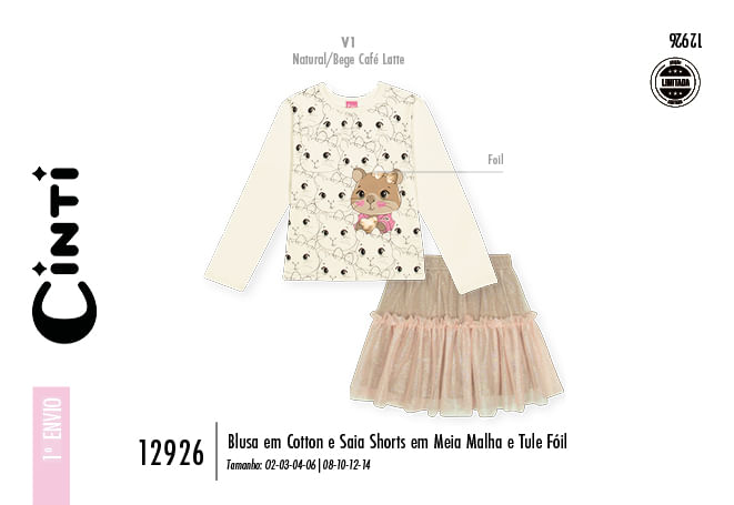 "Este deslumbrante conjunto infantil feminino da coleção Inverno 2026 é a escolha perfeita para as pequenas que buscam um visual de princesa com um toque moderno e fashionista. A blusa, confeccionada em cotton macio e confortável, destaca-se por sua estampa frontal sofisticada com acabamento em foil, que garante um brilho especial e delicado à peça. O grande protagonista do look é a saia shorts, que une a praticidade do shorts interno em meia malha ao glamour de duas camadas de tule king foil com padronagem de conchas, criando um movimento leve e encantador.