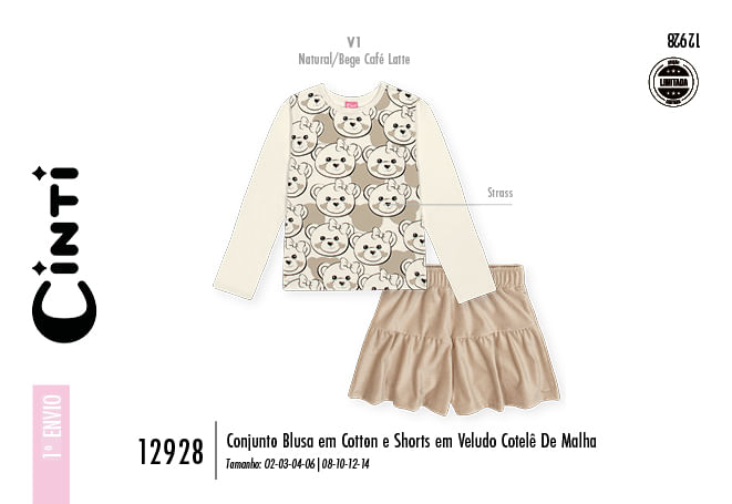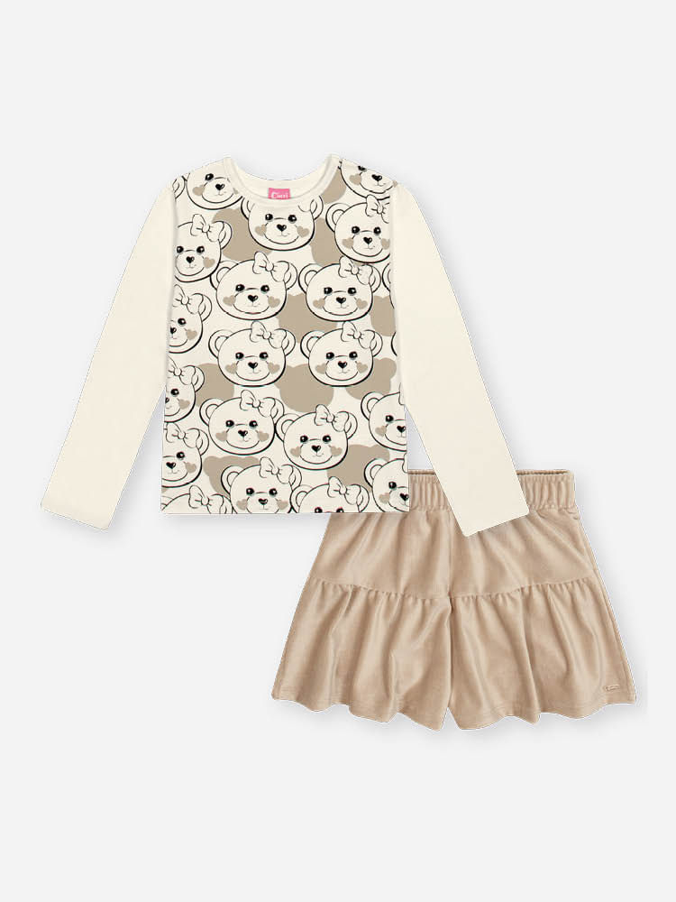 "Este encantador conjunto infantil feminino da coleção Inverno 2026 é a escolha perfeita para quem busca sofisticação e conforto em uma única produção. A blusa, confeccionada em cotton macio, destaca-se por sua estampa frontal delicada e brilhante, enriquecida com a aplicação de strass, que traz um toque de luz e ludicidade ao visual. O grande diferencial deste conjunto é o shorts em veludo cotelê de malha, um tecido nobre que oferece textura rica, toque aveludado e excelente proteção térmica para os dias mais frescos.
