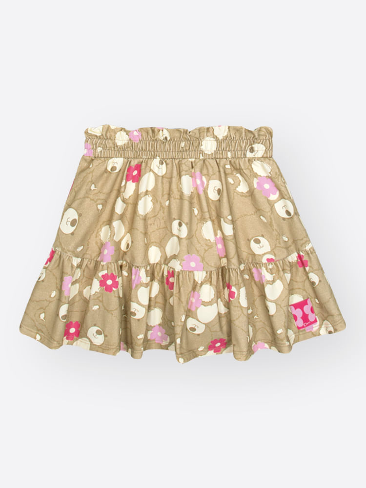 A saia-shorts é o grande destaque da produção, apresentando uma belíssima estampa digital floral que confere um ar primaveril mesmo nas estações mais frias. Com modelagem clochard e cós elástico, a peça possui um recorte franzido que cria um volume gracioso, enquanto o shorts interno em cotton assegura proteção e conforto para a criança brincar sem preocupações. O acabamento premium é selado com uma delicada etiqueta de tafetá em formato de flor, reforçando o cuidado artesanal da marca.